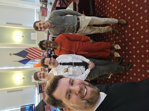 (L to R) Professor Brad J. Reid, Chief Sgt-at-Arms Rafael Perez, and clinic students, Noah Goff ’26 (behind Perez), D'Shandi Coombs ’26, Noah Martz ’25 in the Committee Room of City Hall.