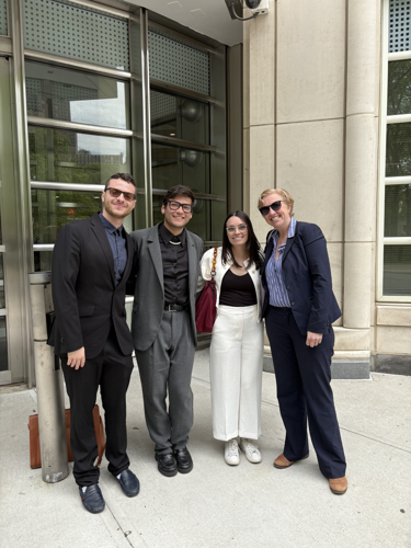 L-R: Spencer Barisch ’26, Justin Murphy ’26, Chelsea Jones ’26 and Professor Susan Hazeldean outside the Eastern District of New York courthouse