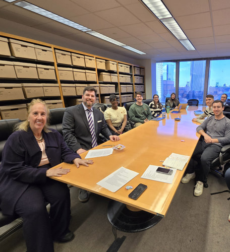 (Clockwise from L to R): The NYC Council Legislation and Policy Clinic gets to work with Council Member Gale Brewer, Professor Brad J. Reid, and students D'Shandi Coombs ’26, Noah Goff ’26, Riley Batman ’26, Nicole Strzepek ’26, Noah Martz ’25, Ravi Rosen ’25, Albulena Uka ’25 meet for an informal conversation on city government and CM Brewer's career.