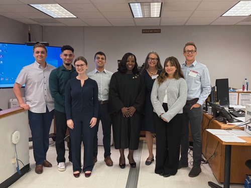 (L to R) Students Joseph Saccomano ’27, Rene Soto-Rivera ’27, Catherine Dirksen ’27, Diego Arvelo ’27, Hon. Pamela P. Fynes, Professor Michelle Minovi, Mia Furnanz ’27 and Jason Fiske ’27 at Small Claims Court in Brooklyn, Night Court, Sept. 9, 2025.