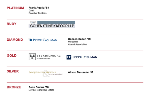 For information about sponsorship opportunities, please contact the Office of Alumni Engagement at (718) 780-7505, or at alumni@brooklaw.edu.
