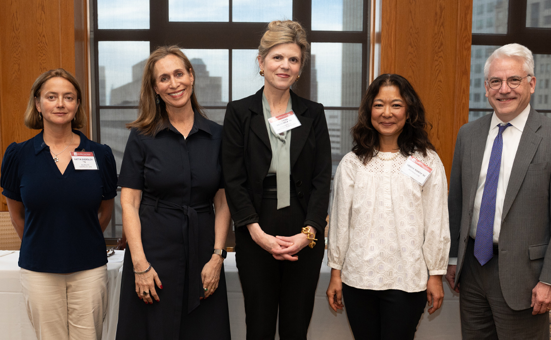 (L to R) Entrepreneurs Katya Sverdlov ’12 and Rachel Foster ’94, moderator and Adjunct Professor Olivera Medenica ’00, Meeka Bondy ’94, and Dean David Meyer at the Women’s Leadership Network on April 22, 2025.